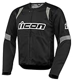 Durable nylon chassis Removable Field Armor elbow and shoulder protectors Removable dual-density foam back pad Removable wind-resistant insulated vest Gathered elastic flex panels on elbows and shoulders Fighter Mesh panels in key areas for superior ventilation Upgradable to Icon Stryker CE-approved back protector Icon attack fit with tailored body and pre-curved arms